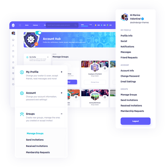 You can also create public and private groups in order to find people that share your same interests! We also created an account hub so you can easily manage lots of stuff, like groups creation, groups management, avatar and cover upload, main profile info, email settings and much more!
